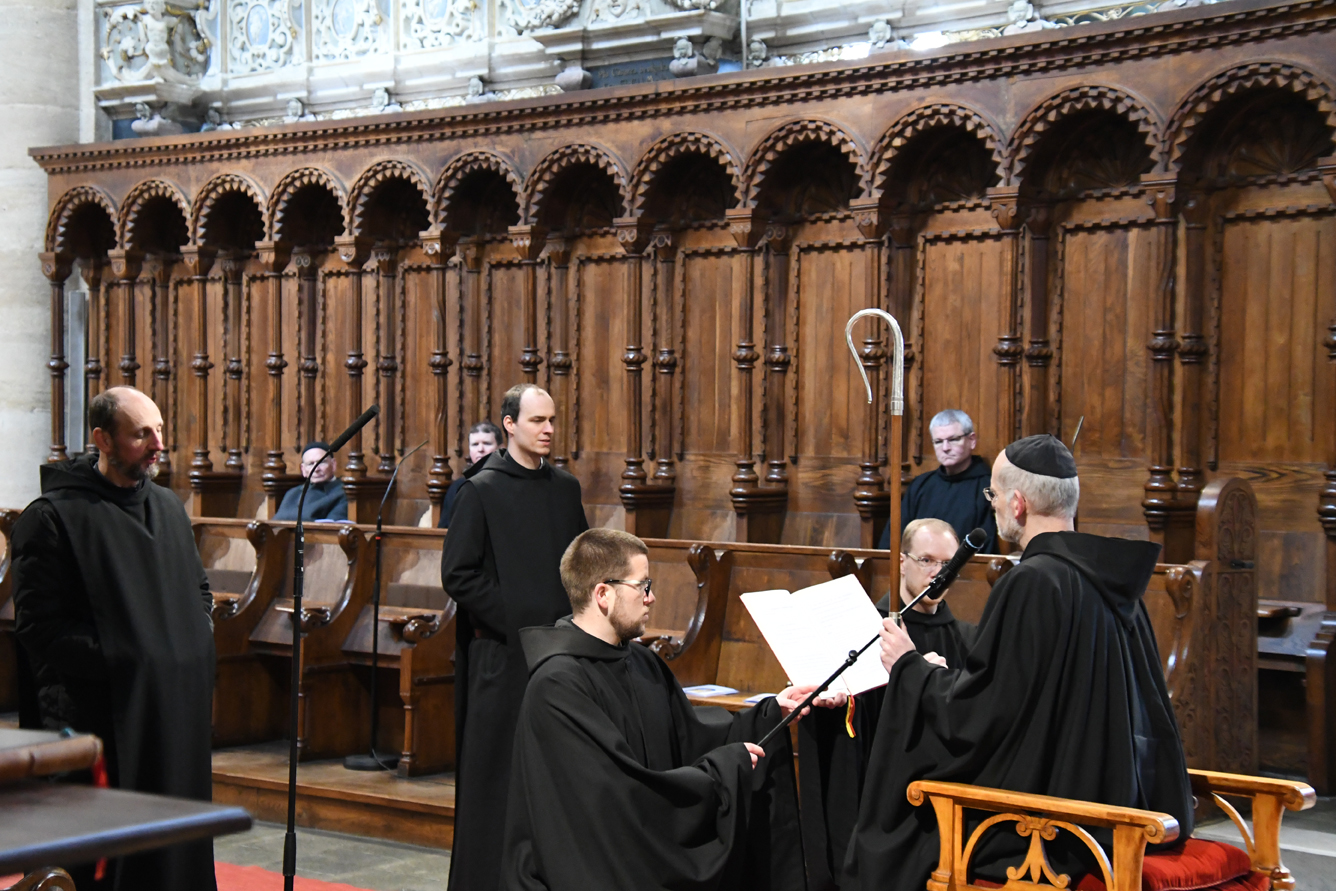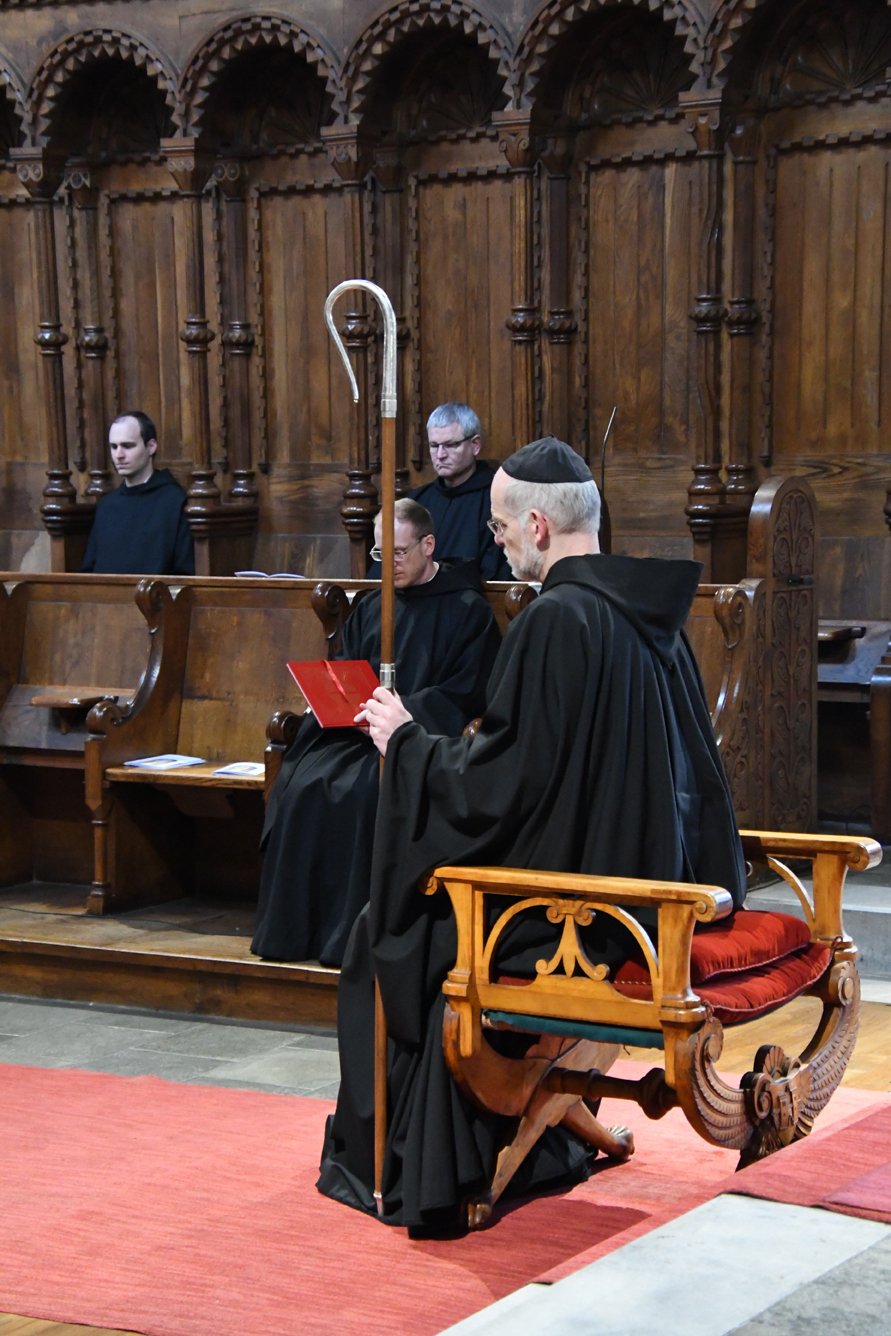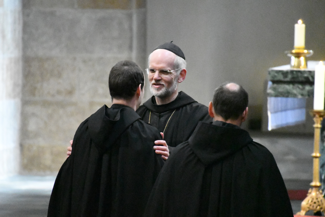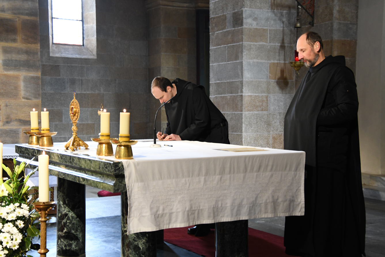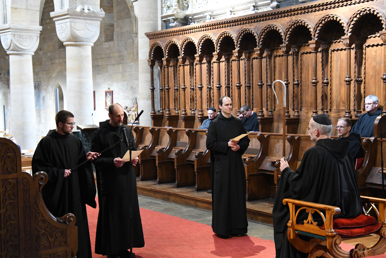 Passend für das von Papst Franziskus ausgerufene Jahr des Hl. Josef, legten unsere beiden Novizen am Hochfest des Heiligen ihre zeitliche Profess ab. Abt Johannes erinnerte Br. Augustinus und Br. Konrad an das Vorbild des Hl. Josef für unser Leben. Darüber hinaus ermutigte er die Neuprofessen als Mönche, gemäß dem Ideal des hl. Benedikt, in Gebet, Arbeit und geistlicher Lesung zu leben. Zur Feier der zeitlichen Profess waren auch die Familien der beiden Brüder gekommen und feierten gemeinsam mit dem Konvent. Unsere Gemeinschaft freut sich sehr über diesen Schritt und wünscht den beiden Mönchen Gottes Segen in den drei Jahren der weiteren Gottsuche.