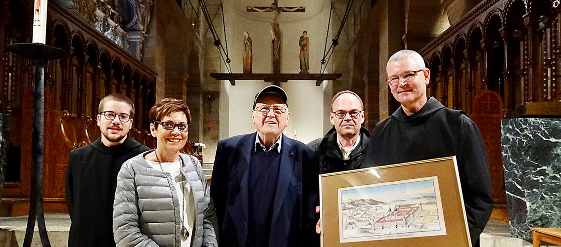 In Vertretung von P. Prior Johannes konnte Br. Seraphim nicht nur die zahlreich erschienenen Konzertbesucher begrüßen, sondern auch Ökonomierat Ing. Friedrich Luchinetti uns seine Gattin Renate. Einer Stiftung der beiden ist es zu verdanken, dass die Seckauer Orgel eine umfangreiche Sanierung während der letzten Monate und Wochen erfahren durfte, die aus Kostengründen in die Innenrenovierung der Basilika nicht einbezogen werden konnte. Umso größer ist nun die Freude über das gelungene Werk des Orgelbauers Walter Vonbank, der die Walcker- Orgel mit 41 Register und 2760 Pfeifen renovierte. Als Dank und „Vergelt´s Gott“ für die nun wieder reinen und strahlenden Töne überreichte Br. Seraphim stellvertretend für den Konvent dem Gönner und Orgelliebhaber einen limitierten Faksimiledruck einer alten Ansicht des Klosters aus dem 17. Jahrhundert. Das Konzert spielte Universitätsprofessor Manfred Tausch.